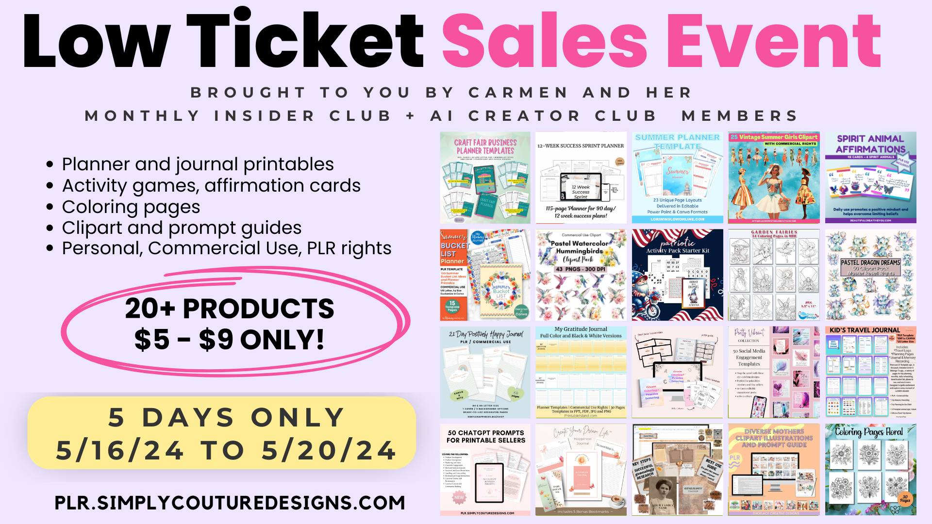 Low Ticket Sales Event Brought To You By Carmen, plus her Monthly Insider Club and AI Creator Club Members. Everything in the event are priced at $5 to $9 each. There are both PLR and Personal use products. No coupon code is needed