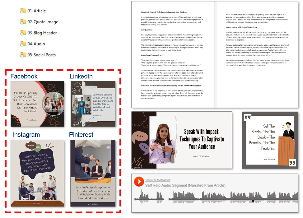 This free PLR pack helps anyone in your audience to master the art of public speaking. There are two articles with accompanying audio, each with four social media posters, quote image and blog header image. They can be used as branding content (publish it freely online anywhere you see fit) to drive traffic to your website, blog, paid course portals, and membership site(s).