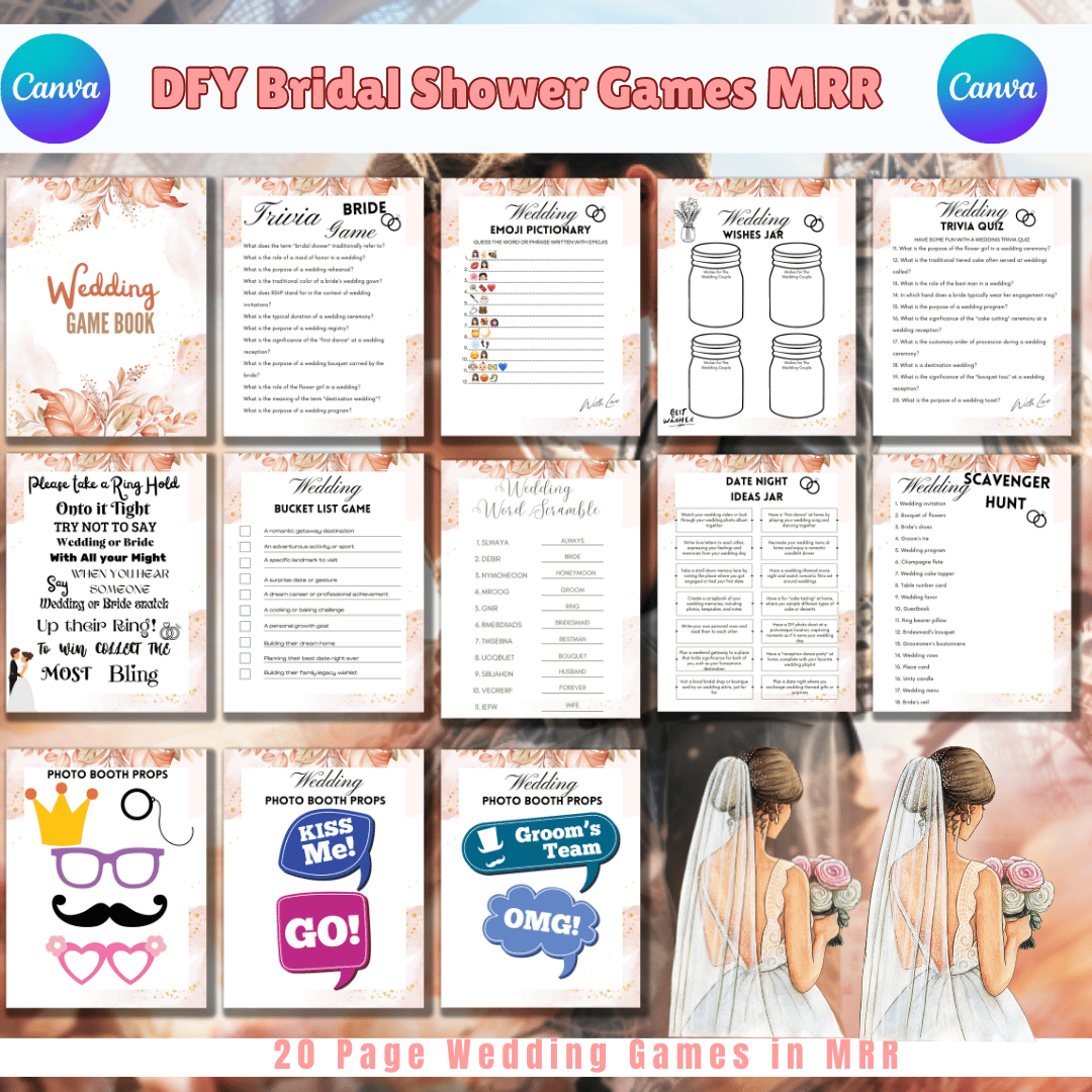 Details: DFY Bridal Shower Games Kit MRR This is a 20 page set of completely Done For You Bridal Shower/Wedding Shower Party Games that are ready for you to list on Etsy, Shopify, or your own website! Note: This is just in Canva! Perfect Bridal/Wedding Shower Party!