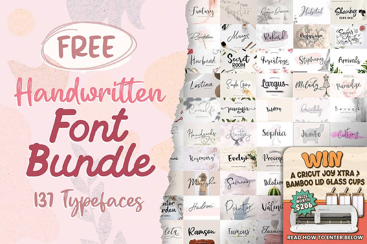Look toward the bottom of this email for the FREE – Handwritten Font Bundle and your chance to WIN a Cricut Joy Xtra Smart Cutting Machine & Glass Cups worth $206!