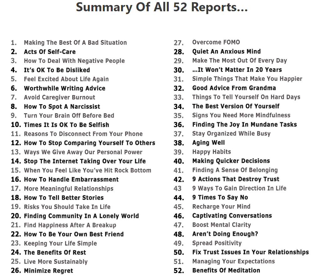 These are short reports built around a single topic in the Self Help and Personal Development niche.