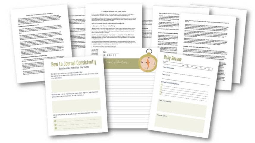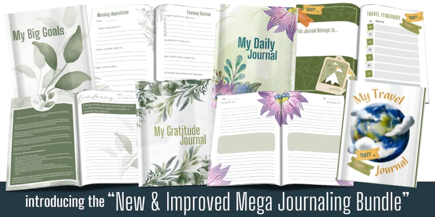 This HUGE journaling bundle includes 4 all-new watercolor journal designs – Daily, Gratitude, Goal-Setting, and Travel – plus 4 lead magnets/reports on different journaling topics, an in-depth 34-page eBook, editable eCovers for the journals, reports, and ebook (14 designs total), 50 journaling articles (over 20,000 words total), 400+ journaling prompts, and more.