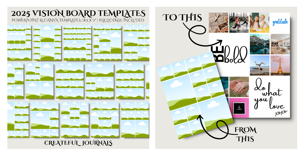 This is a pack of 20 PowerPoint and Canva layouts designed for vision board books.