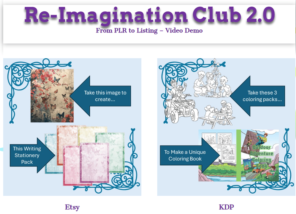 The Re-Imagination Club 2.0 is a monthly membership designed to guide you step-by-step in listing new products on Etsy and Amazon KDP.