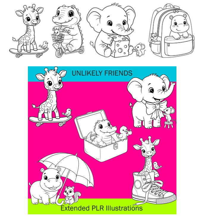 If you make coloring books or coloring page packs you may want to check out Maureen’s new โUnlikely Friends Coloring Book Charactersโ coloring pack for us. This is a bundle of 125 adorable black-and-white coloring book characters and it’s currently on sale for only $15. Check it out.