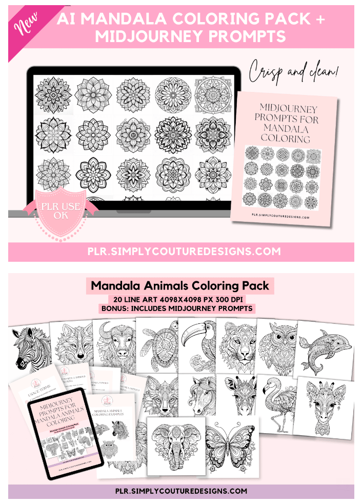- A collection of 20 clean and crisp mandala animals coloring pages generated by Midjourney. Includes PLR Product License to use these mandalas to create PLR Products to sell. Includes the Midjourney prompts for you to create clean and crisp mandala animals coloring designs.