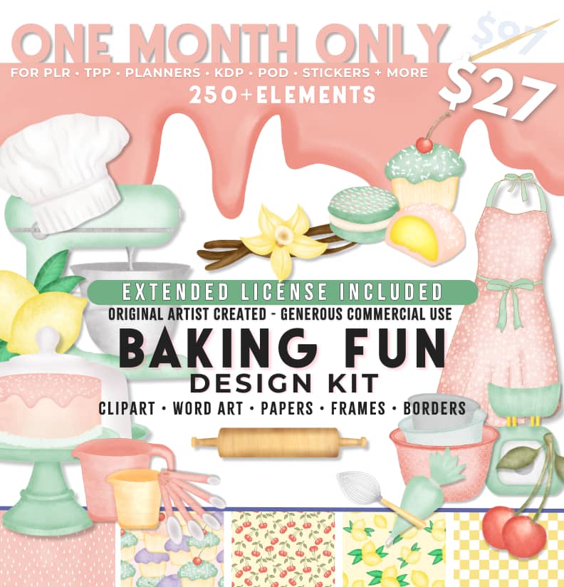 The design kits are AVAILABLE FOR ONE MONTH ONLY inside the membership. All of Katherine’s personal hand-drawn or painted illustrations and high-resolution elements can be used to create PLR, digital products, physical products, and TEMPLATES (to name a few) which is MUCH MORE than any typical commercial use license.
