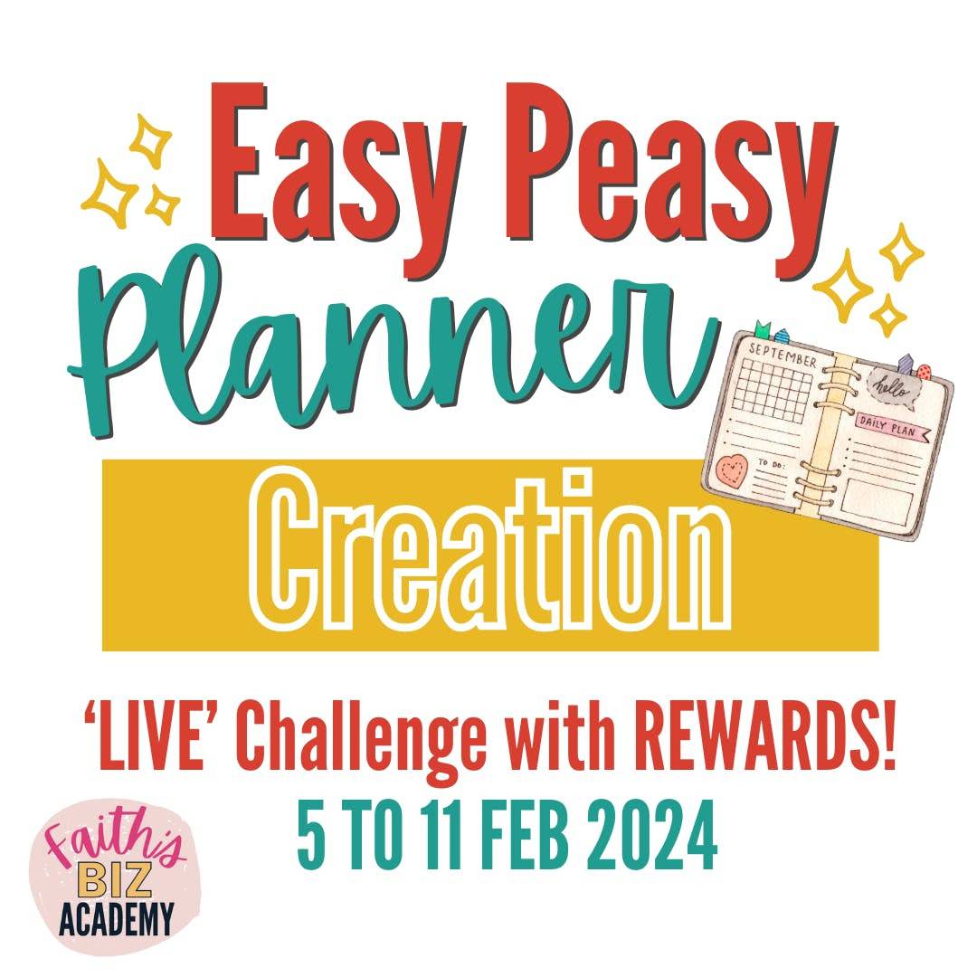 Join us for our Easy Peasy Planner Creation ‘LIVE’ Challenge from 5 to 11 Feb 2024 to create a brand new planner with Canva that you can sell, enjoy accountability on our pop-up Facebook group, direct guidance and feedback from Faith, and receive attractive CHALLENGE REWARDS!