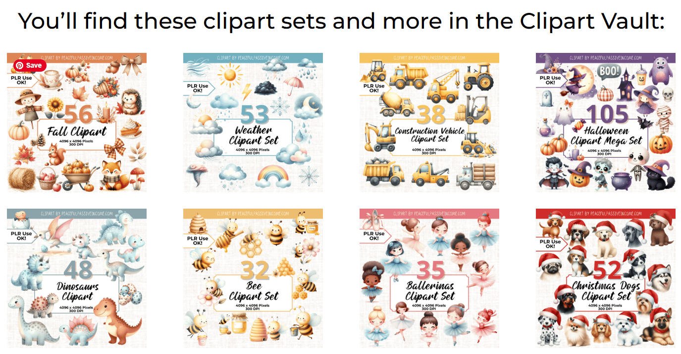 Did you miss the Clipart Party? Carrie from Peaceful Passive Income has given you another chance! You can get all 10 clipart sets from the Clipart Party (Animal Alphabet, Detective, Emergency Vehicles, Farm Animals, Hearts and Flowers, Kitchen, Mermaid, Music, Spring Cleaning, Winter Activities) for just $37 through October 24th!