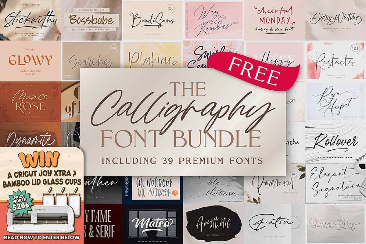 Look toward the bottom of this email for the FREE – The Contemporary Calligraphy Font Bundle and your chance to WIN a Cricut Joy Xtra Smart Cutting Machine & Glass Cups worth $206!