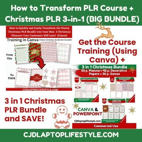 This Christmas bundle offers you the best value of Christmas products with the Christmas PLR Bundle Transformation Course and the Christmas PLR which has the 53-page Christmas Planner+ 43-page Christmas Decorative Papers + Christmas Games!