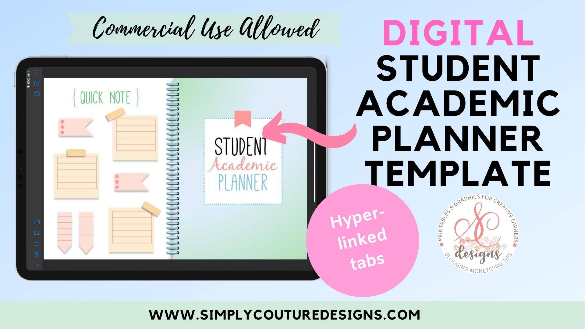 A Complete Digital Student Academic Planner with 135 digital planner spreads, including Tabs, Hyerlinks, Quick Note Page, and Stickers to run on GoodNotes. Everything that a student will need to organize his/her school life.