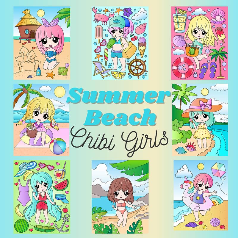 The front-end offer includes 30 adorable Summer Beach Chibi Girls in black and white. PNG & SVG are included.