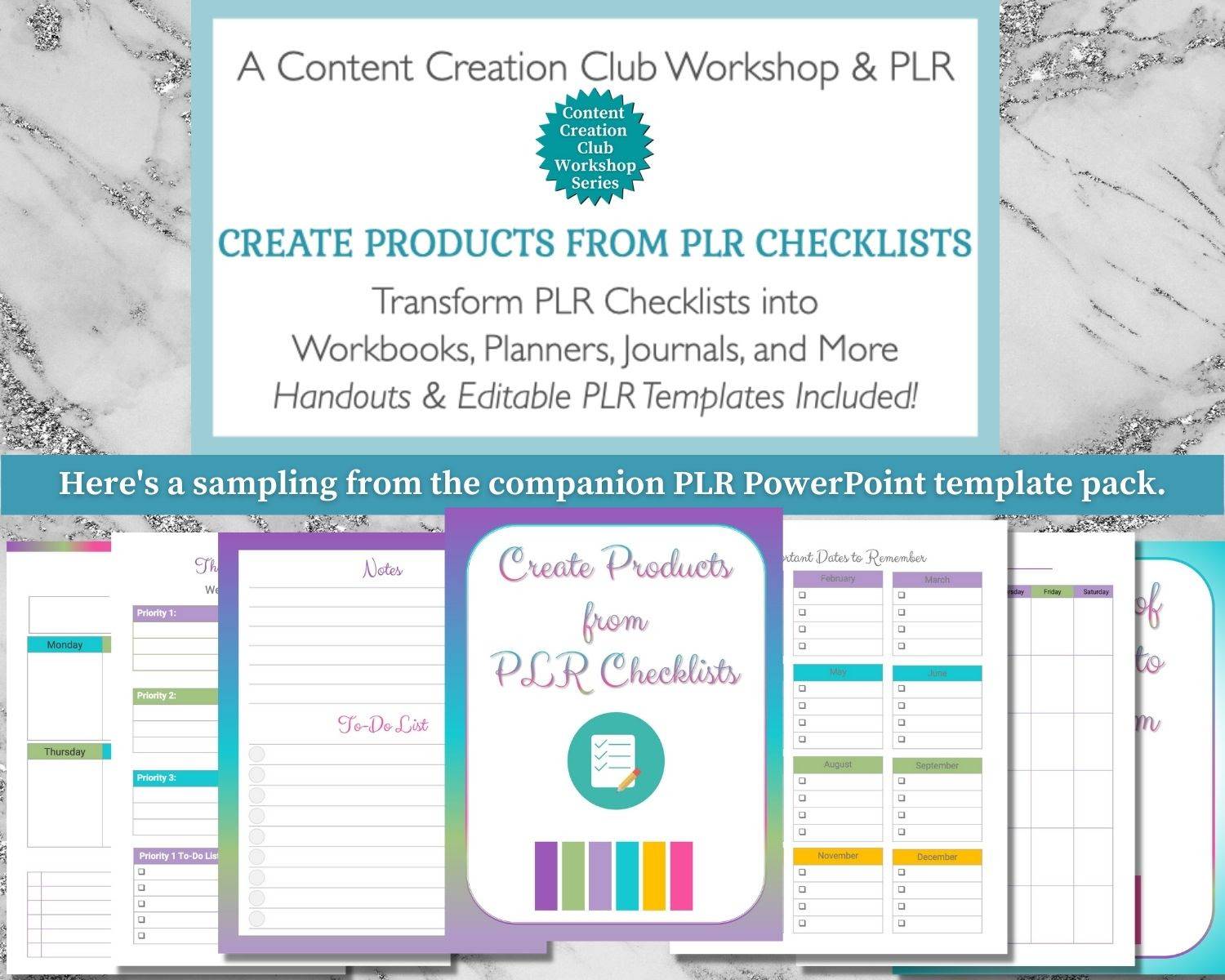 How to Transform PLR (Private Label Rights) Checklists into Workbooks, Planners, Journals, and More. In this workshop, participants will discover how to use the companion pack of done-for-you PLR templates, to design and hyperlink digital notebooks. We’ll explore a wide variety of types of notebooks that can be created.