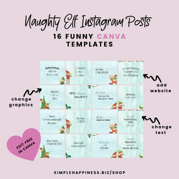 You can get this set of 16 funny Instagram Canva Templates with Naughty Elf Design (usual cost $27) for FREE this weekend using coupon code INSTAELF