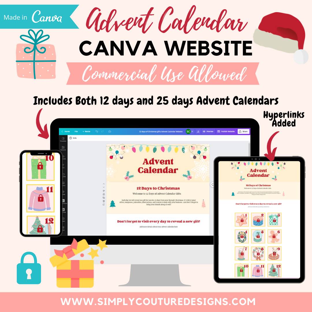 Introducing Advent Calendar Canva Website template. Set up your own Advent Calendar Website using the Free version of Canva in minutes and promote your products or services. Get ready to celebrate with your customers and offer them your latest products and offering in a unique, festive way!
