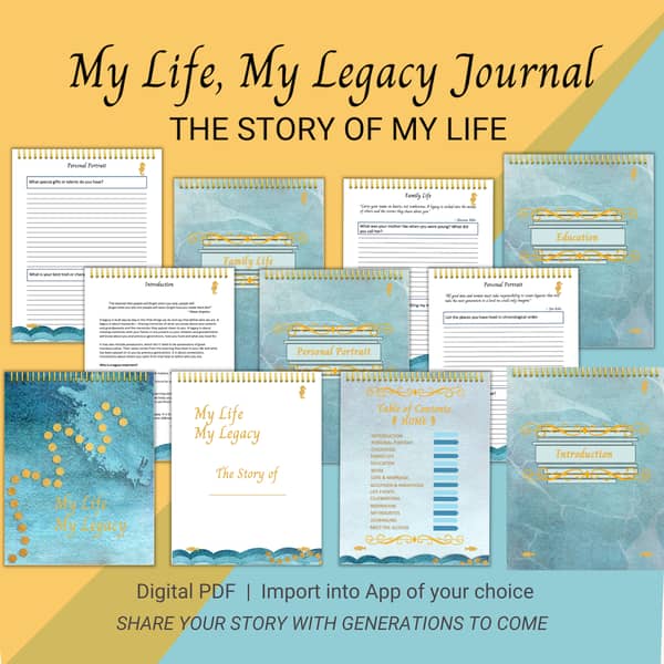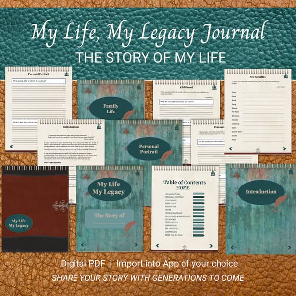 This 109-page digital journal is how you can share your story, your legacy with your family and future generations of your family. Questions in the 13 sections of the journal cover all aspects of your life. All you need to do is record your responses for posterity.