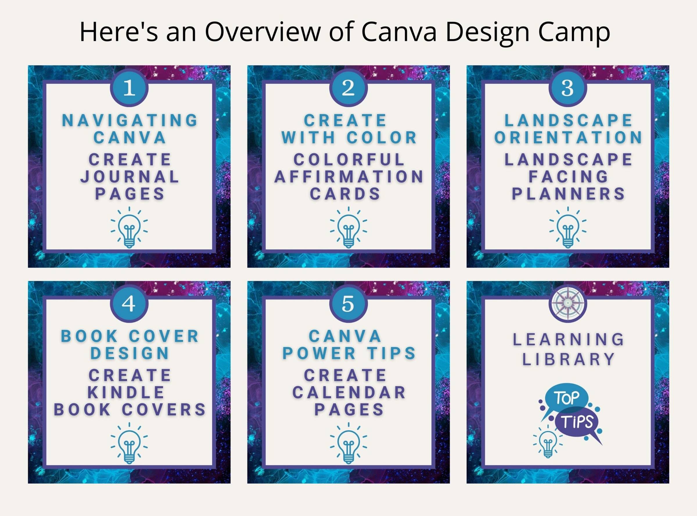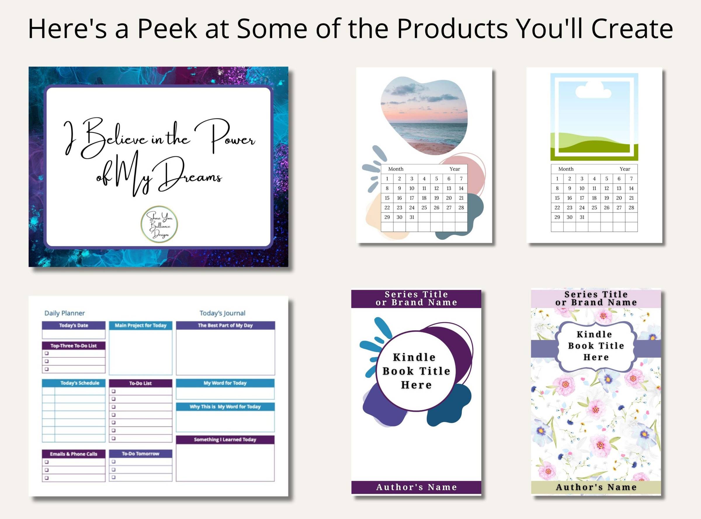 In this interactive program, you’ll learn how to use and navigate Canva so you can easily create and design an unlimited number of products. In Design Camp, you’ll use the free version of Canva to create a wide variety of products such as: Printable Journals, Colorful Affirmation Cards, Landscape Facing Planners, Kindle Book Covers, and Clever Calendar Pages.