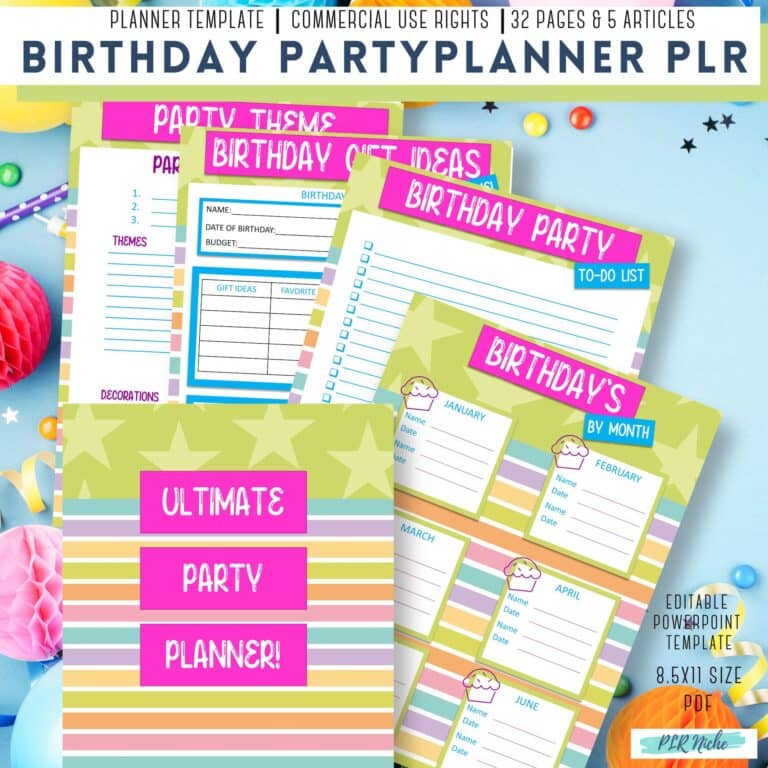 The Birthday Party Planner PLR has 32 pages and it’s 8.5″x11″ with PowerPoint Template, PDF File, and Font List. And the bonus of 5 Articles (2,868 words) with Cover. Check it out today!