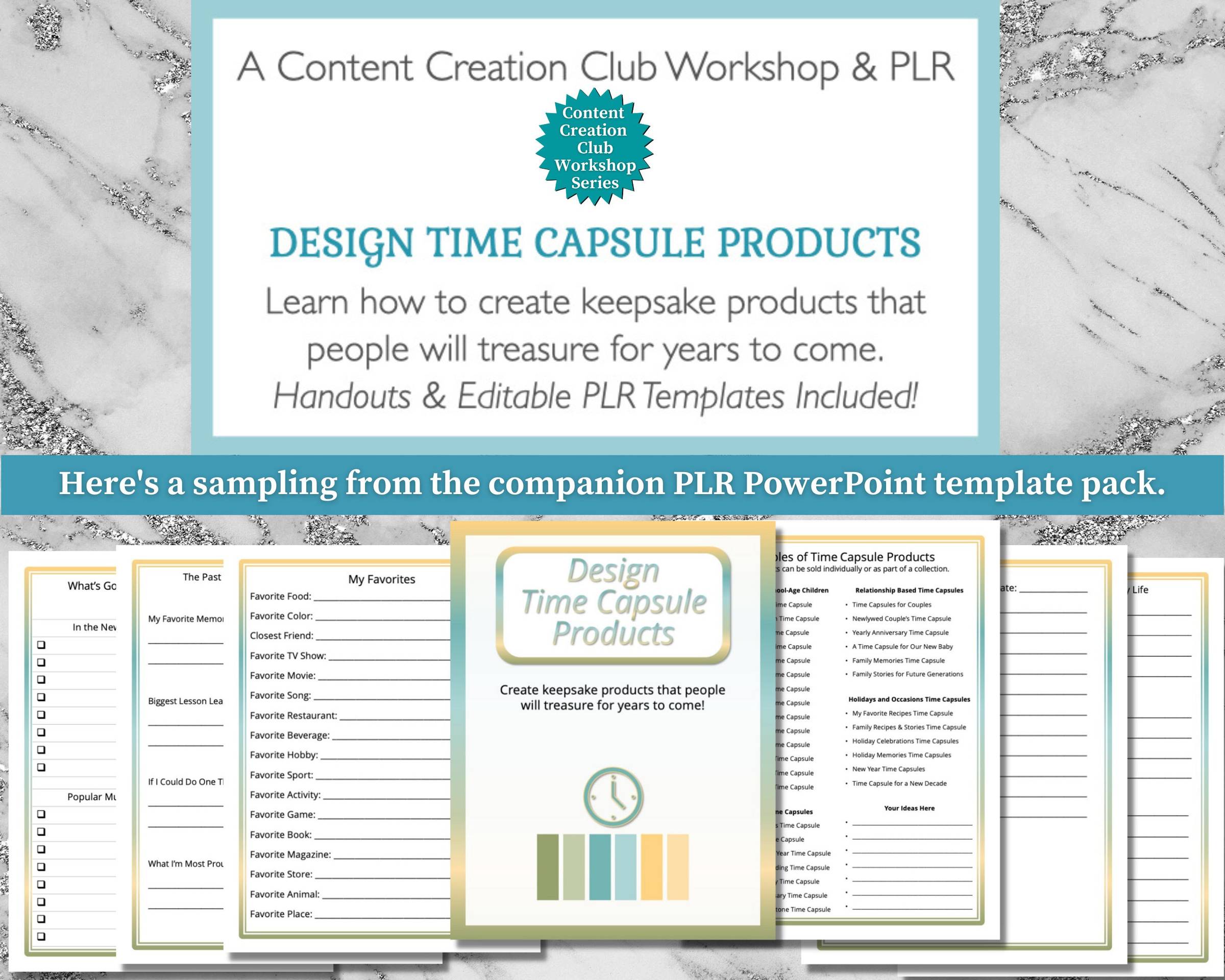 In this workshop participants will learn how to create keepsake products that people will treasure for years to come. We’ll explore a variety of product ideas, which are designed to also spark more ideas for you! The companion PLR Pack for this workshop includes templates that you can use to create a variety of time capsule products.
