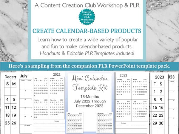 Create Calendar-Based Products. In this timely workshop, we’ll explore a variety of fun to make calendar-based products that you can add to your product line. Calendar-based products are in high demand and people always need them. They are also perfect products for repeat purchases. Handouts and editable calendar-based PLR templates are included.