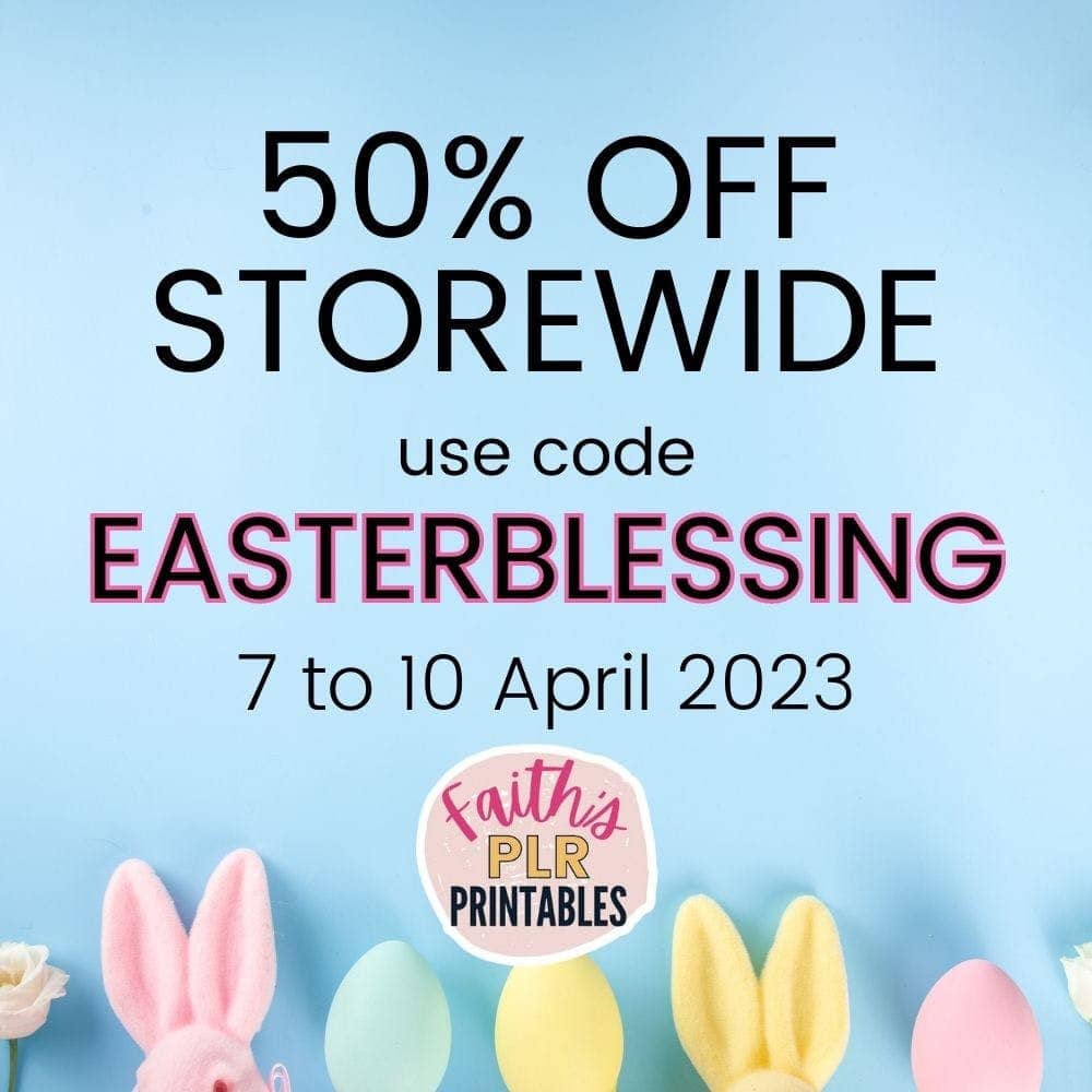 Use code EASTERBLESSING to enjoy 50% off all my PLR products in store.