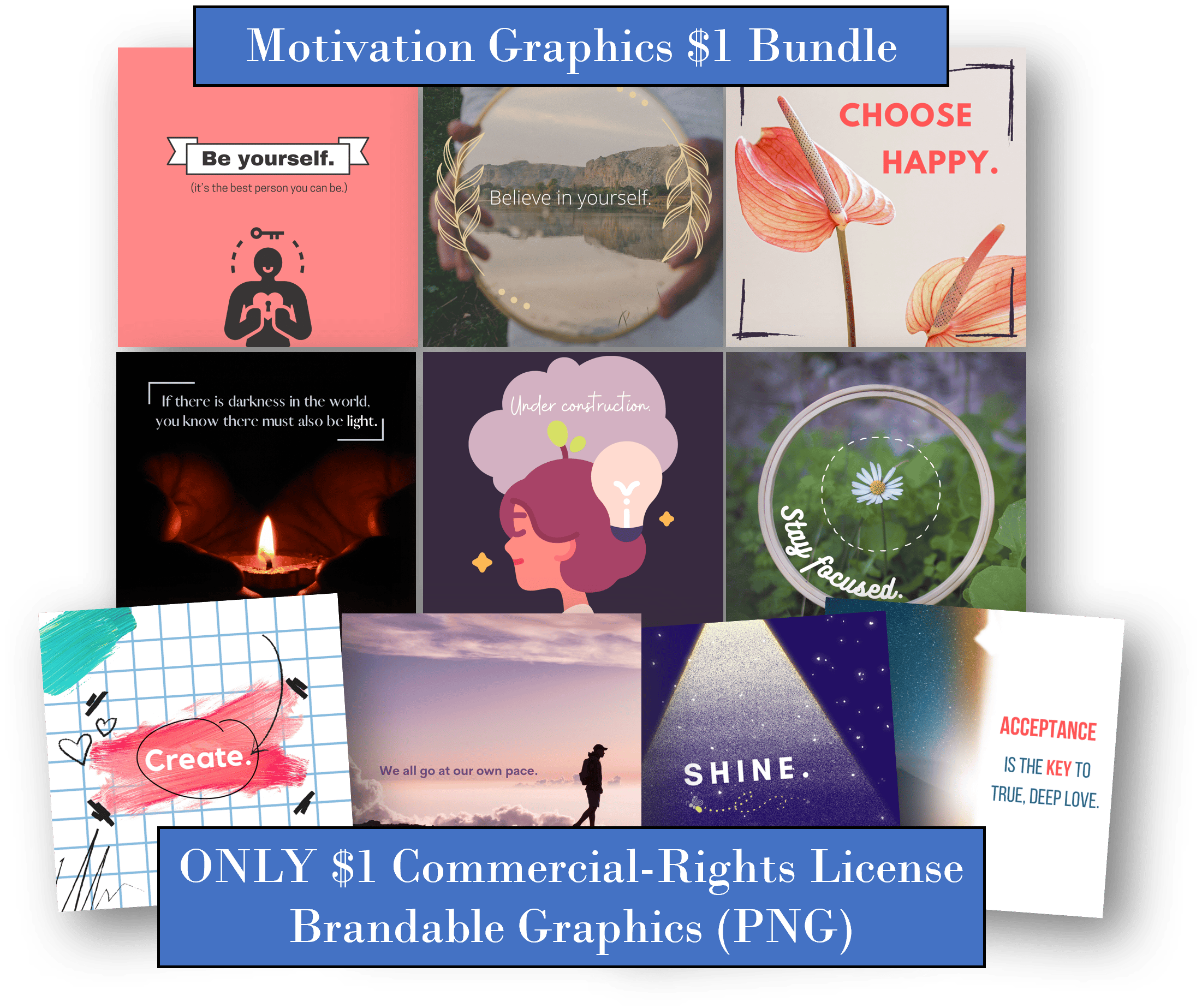 Yep, just $1 for a gorgeous pack of inspirational graphics you can use for social media, on your website and more. You get 10 Motivational Graphics (PNG).