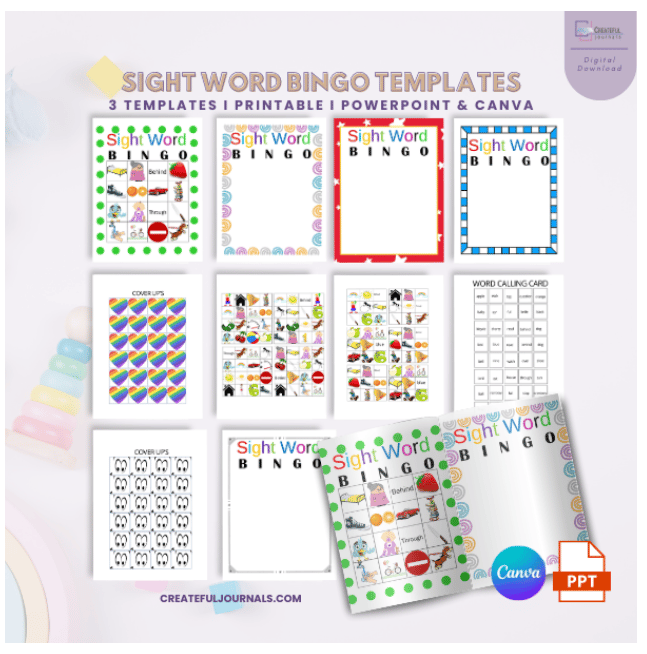 This set comes is available in both PowerPoint and Canva Layouts. The pack contains 40 templates with both word and picture calling cards.