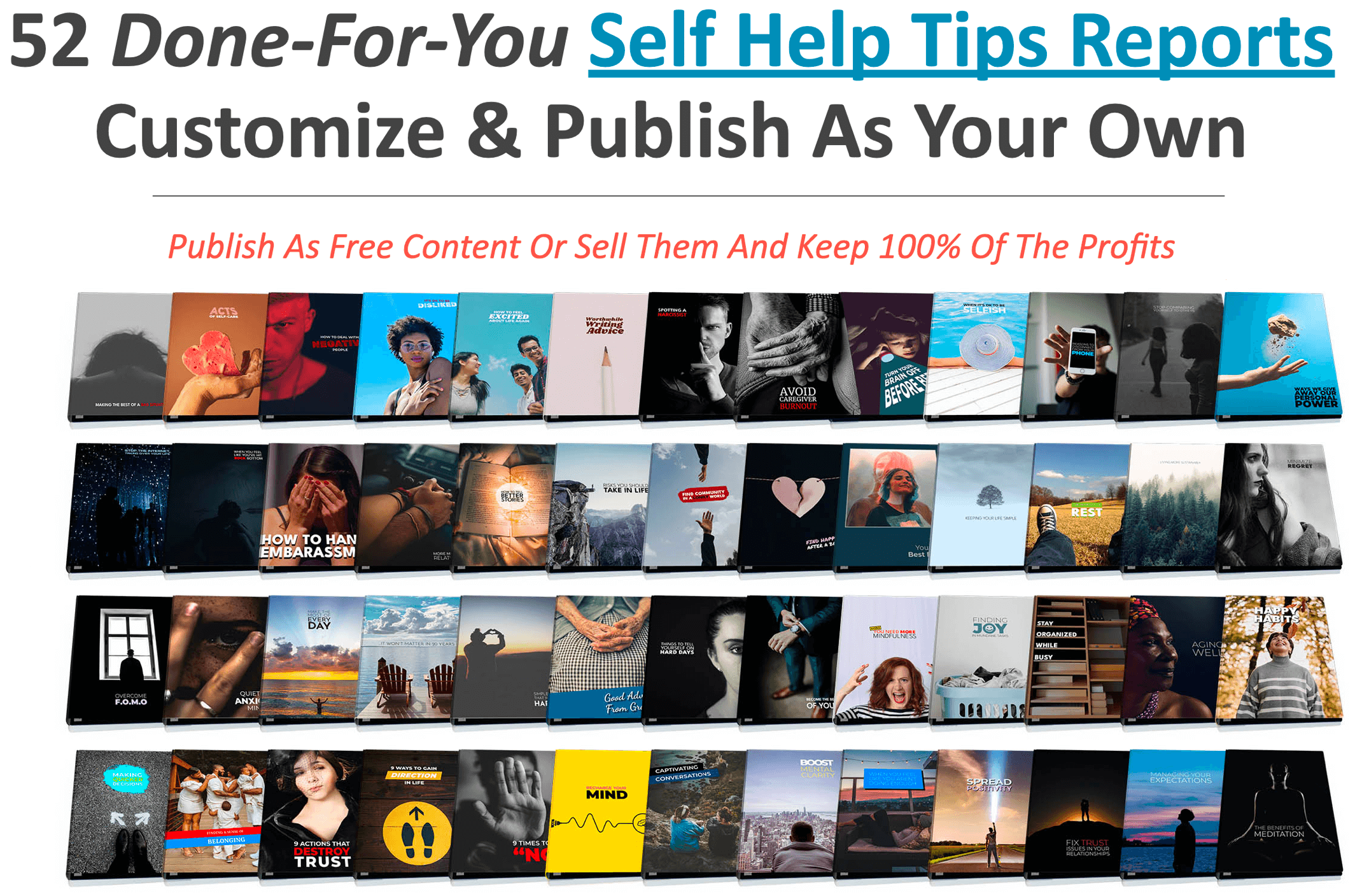 These are short reports centered around a single topic in the Self Help and Personal Development niche. Each report is designed to give quick, actionable advice to your audience without overwhelming them with info or asking them to make a huge number of changes in their life.