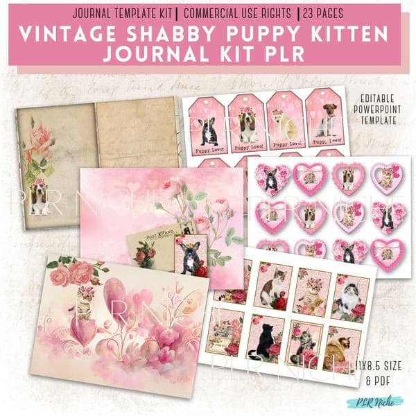 THE VINTAGE SHABBY PUPPY & KITTEN VALENTINE JOURNAL KIT PLR Template comes with 23 pages with everything from journal covers to Valentine trading cards. The theme is in a shabby chic style with cute puppies and kittens making this super cute.