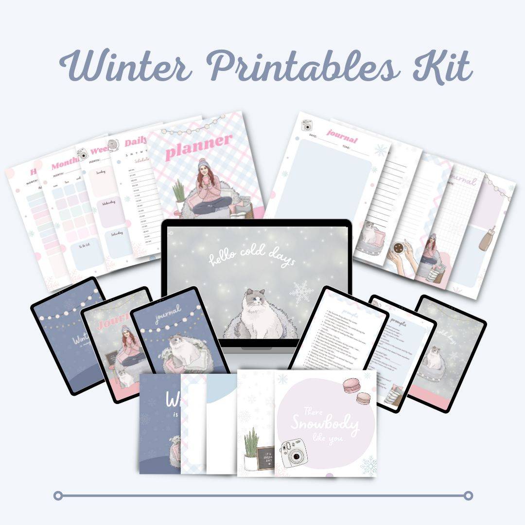 Introducing the Winter Printables Kit, a collection of beautifully designed and customizable printables to help you create a variety of winter themed products. The Winter Printables Kit is perfect for anyone looking to create and publish winter themed products, including planners, journals, calendars, and social media posts.
