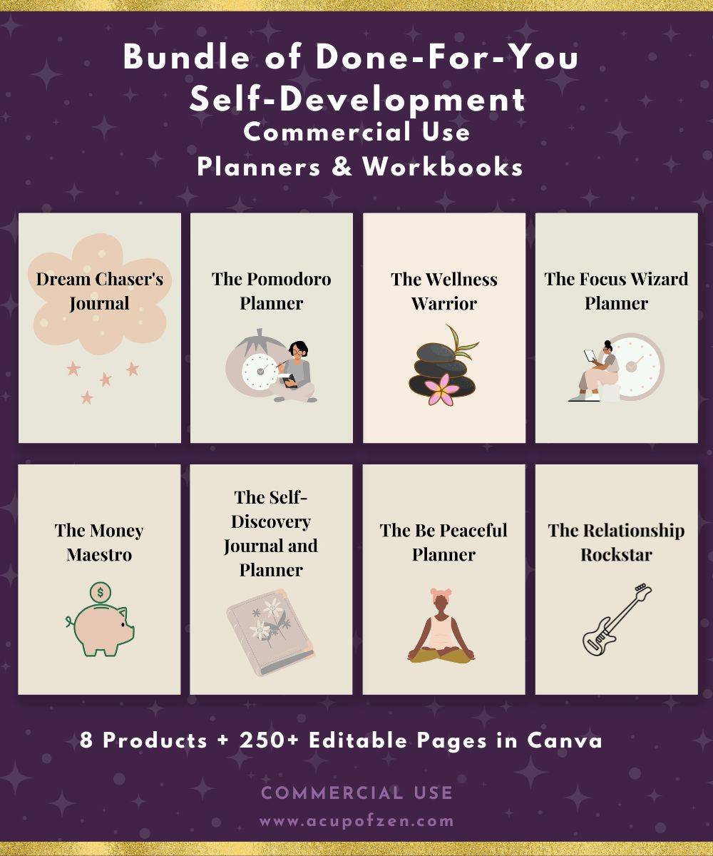 Are you looking to help your customers take control of your personal growth and achieve goals like never before? Look no further than this bundle of 8 self-development planners and workbooks! The bundle includes a collection of customizable planners and workbooks that cover a variety of topics, from goal-setting and productivity to self-care and mindfulness. With these tools, you’ll have everything you need to stay organized, motivated, and on track to your dreams.