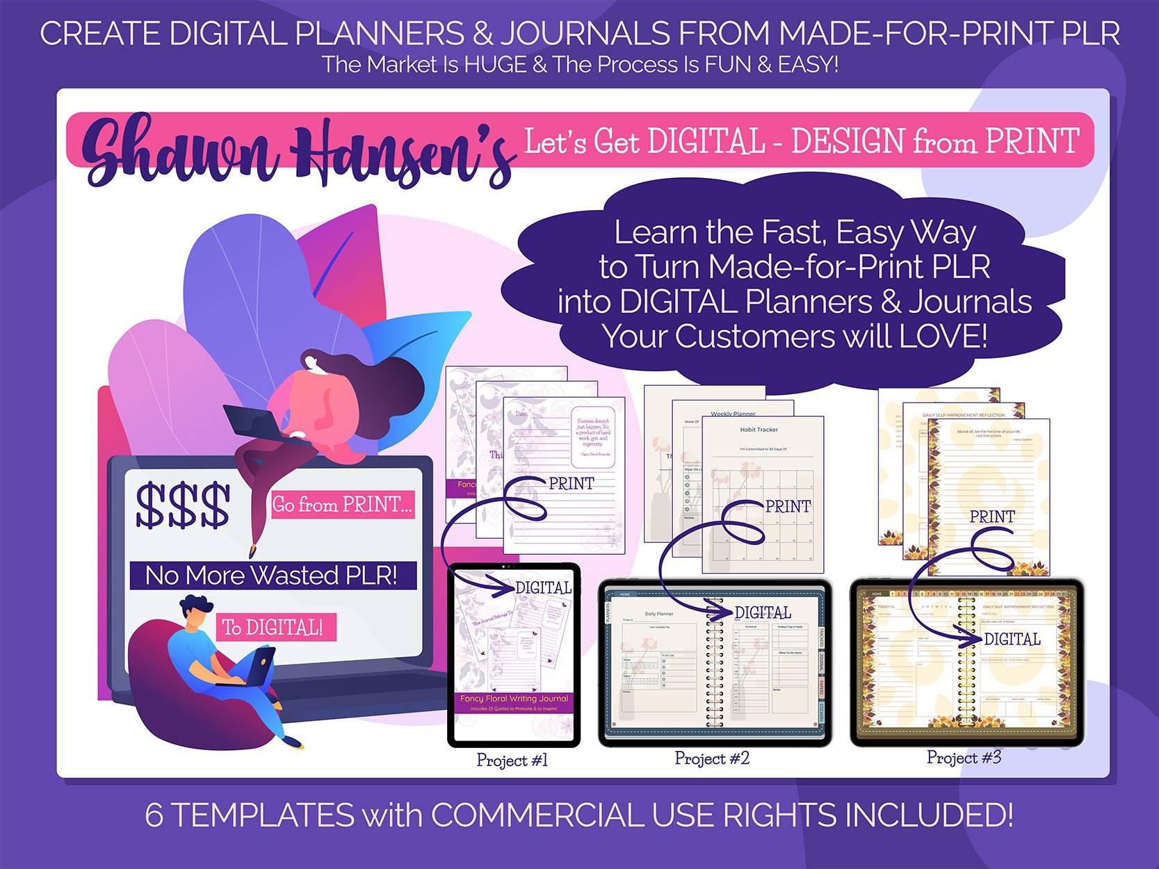 Along with the trainings, you’ll get the templates, graphics, and colors you need to follow along, so by the end of the course you’ll have FOUR NEW PRODUCTS you can SELL, and you’ll know EXACTLY how to turn almost ANY Made-for-Print Journal, Planner, or Notebook into a DIGITAL version in just MINUTES!