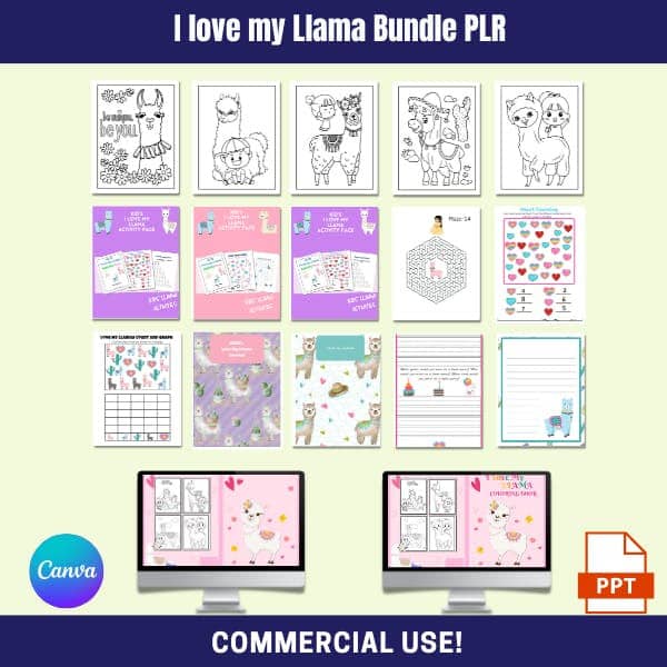 This amazing bundle is jam packed with the following packs! Includes 4 packs! I love My Llama Coloring Pack PLR, Children’s Activity Pack, Children’s Journal, and the I love My LLama Blank Lined Journal! This includes the I love my Llama Coloring Pack PLR – 50 pages of unique images and 2 covers, one with and without the title! Child’s Llama Math, Mazes and More Activities Pack PLR A 45+ page pack of unique llama activity games for kids, available in both Canva and PowerPoint files.
