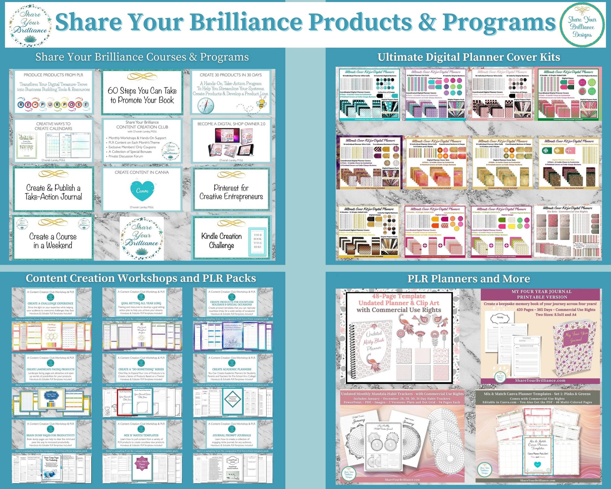 Save 60% on any product or program on the Share Your Brilliance site, (aside from the Club.) The coupon can be used multiple times on any of the Courses, Training Programs, PLR Planners, Digital Planner Cover Kits and Workshops with PLR Packs.