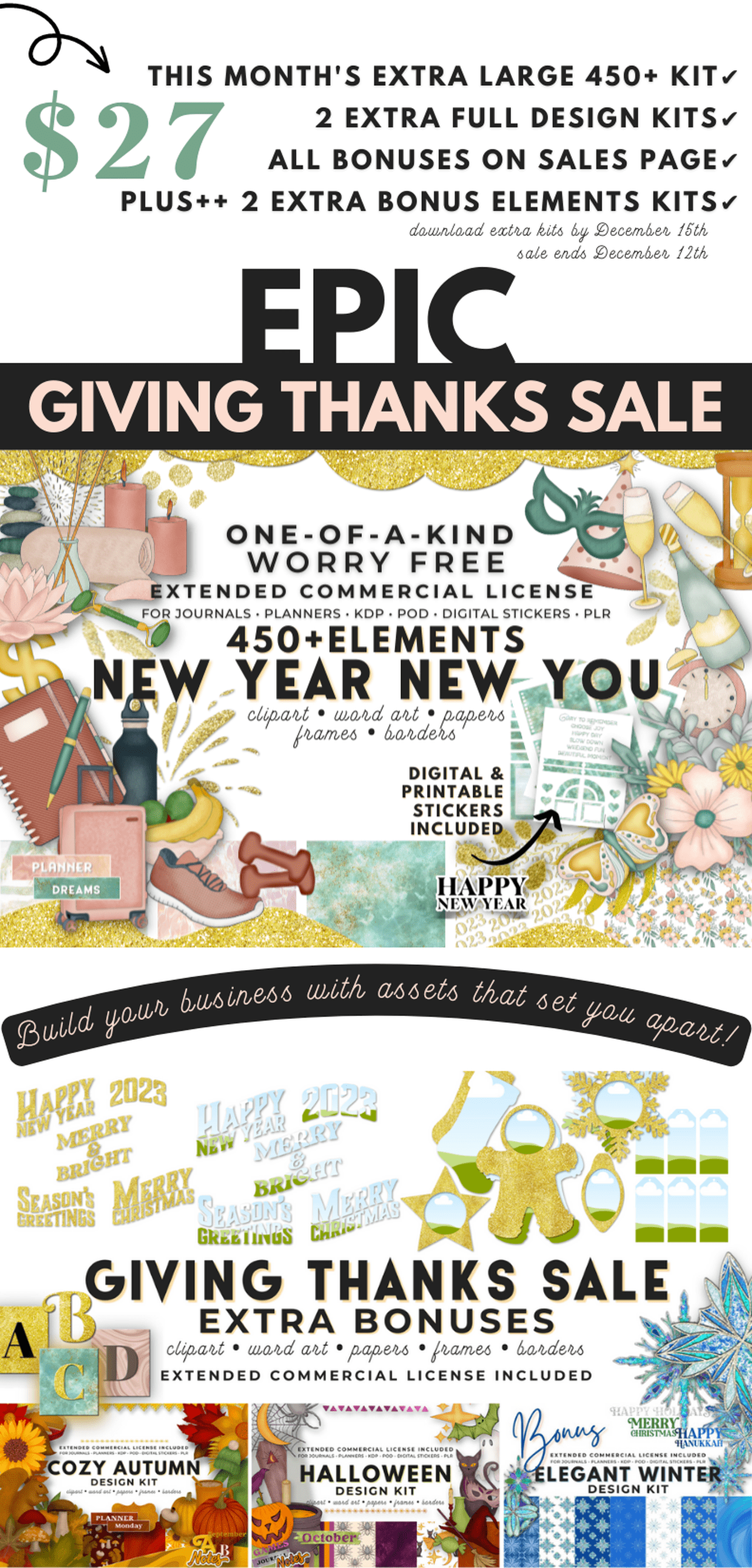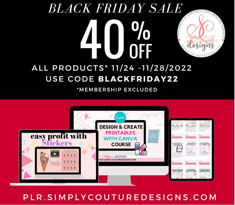 40% off all products including PLR templates, clip art, line art packs and Canva product mockup templates (except membership), from 11/24/22 to 11/28/22 at 11:59pm PST.