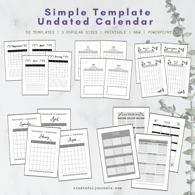 This pack of Simple Templates includes 4 different layouts of undated calendars. Including 4 layouts for the full year.