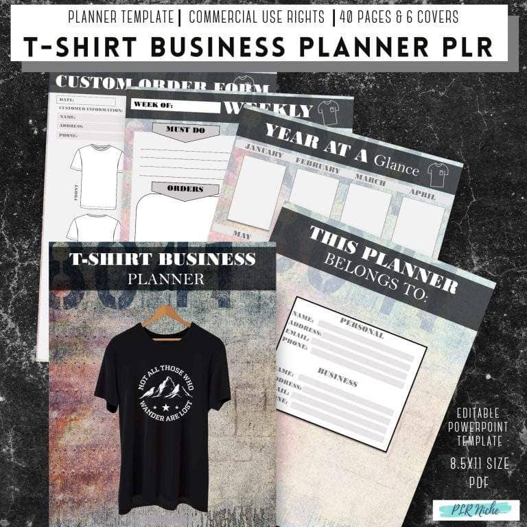 THE T-SHIRT BUSINESS PLANNER PLR Template comes with 40 planner pages with 6 different covers. The template is 8.5″ x 11″ with an Editable PowerPoint File, PDF File, Font Files, and Commercial Use Rights.
