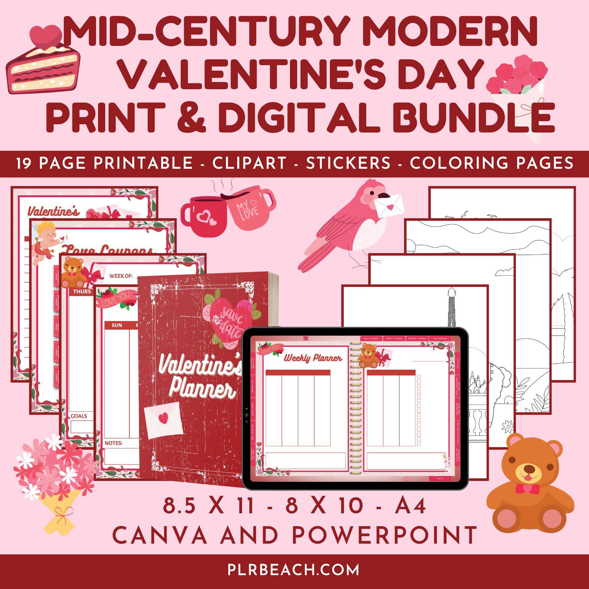 In this super cute bundle, you get a 19 page printable Valentine’s Planner in Canva, PDF and PowerPoint. You also get 35 clipart not sold anywhere else, 35 digital stickers, 4 sticker sheets for Cricut machines and hand cut, and 10 coloring pages in black and white and color. For $10 more, you can get a matching GoodNotes digital planner with DFY linking tabs. Get this adorable planner bundle now to list for the upcoming Valentine’s Day holiday.