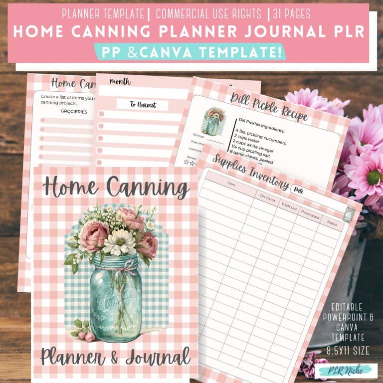 THE HOME CANNING PLANNER JOURNAL PLR Template comes with 31 unique pages! It comes in the popular 8 1/2″ x 11″ size with the editable PowerPoint File and Canva Template. Along with PDF File, and Font Files, all with Commercial Use Rights.