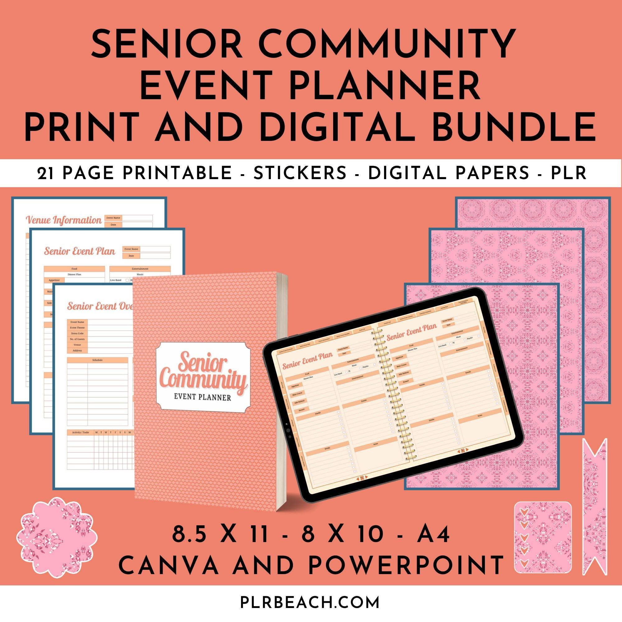 Your customers will love this amazing bundle with a 21 page printable planner in PowerPoint and Canva. The sizes are 8.5 x 11, 8 x 10 and A4. Also included are 30 digital papers and 140+ digital stickers. For $10 more, you get a matching GoodNotes digital planner in PowerPoint and PDF with instructions. Help your customers design their senior community event now by investing in this bundle today!